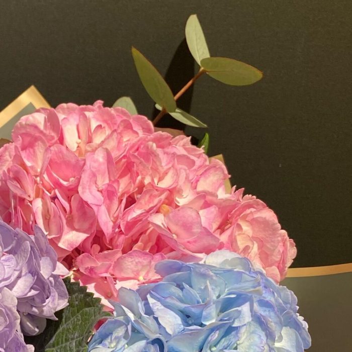 Гортензия – 3 шт. Эвкалипт – 4 шт. Лента атласная – 3 шт. Тишью – 2 шт. Слюда упаковка – 2 шт. салфетка декоративная – 4 шт.
