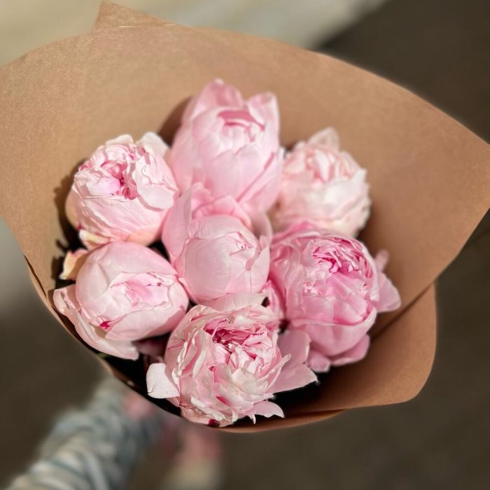 Лента атласная – 1 шт.Крафт упаковка – 2 шт.пион розовый рене – 7 шт.