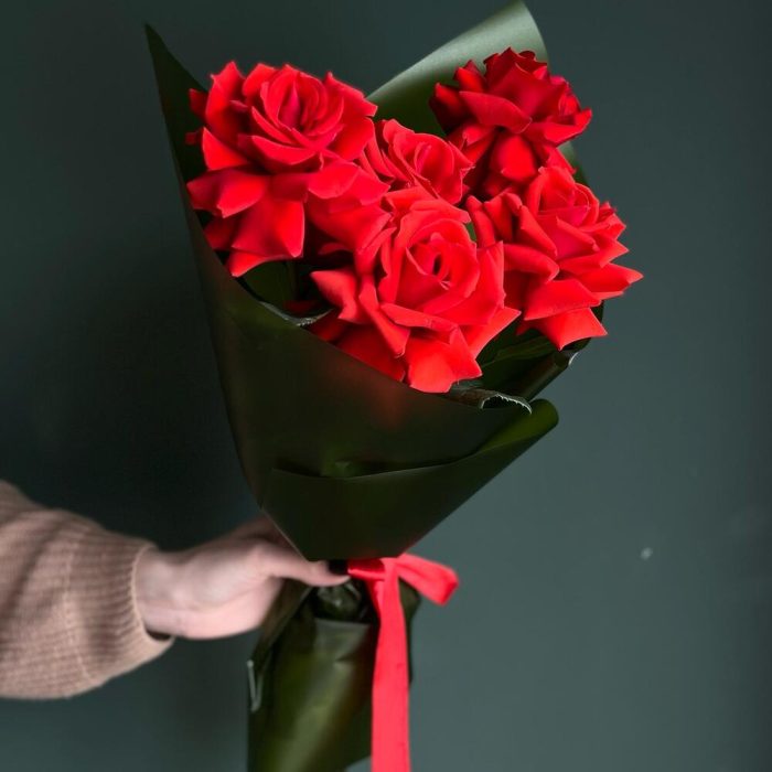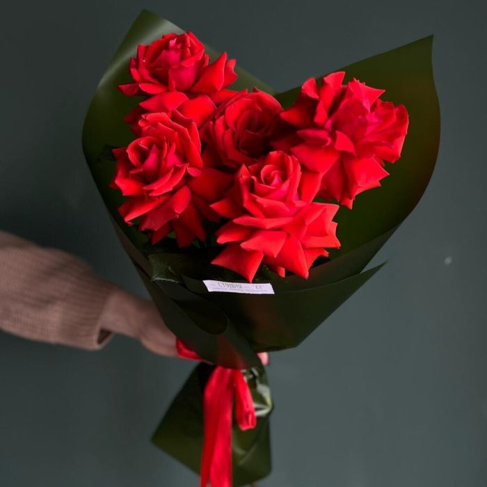красная французская роза – 5 шт.Авторская упаковка – 1 шт.Мини открытка – 1 шт.Аквабокс – 1 шт.транспортировочная упаковка – 1 шт.