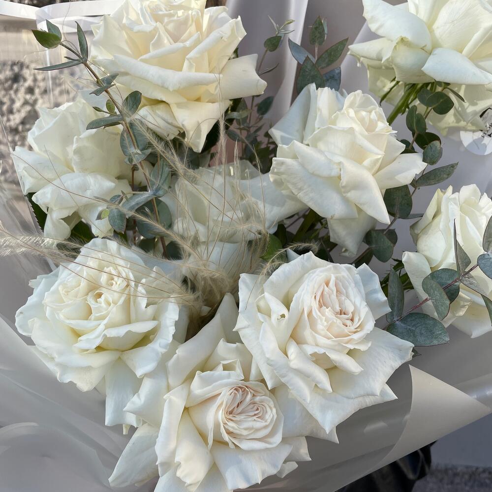 Эвкалипт – 4 шт.Роза – 9 шт.Лента атласная – 2 шт.Упаковка дизайнерская – 6 шт.Ковыль – 1 шт.