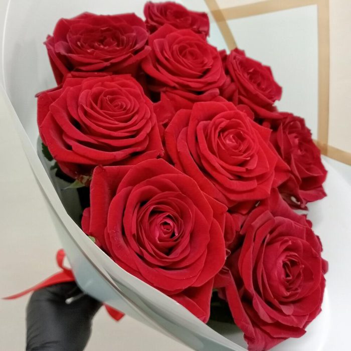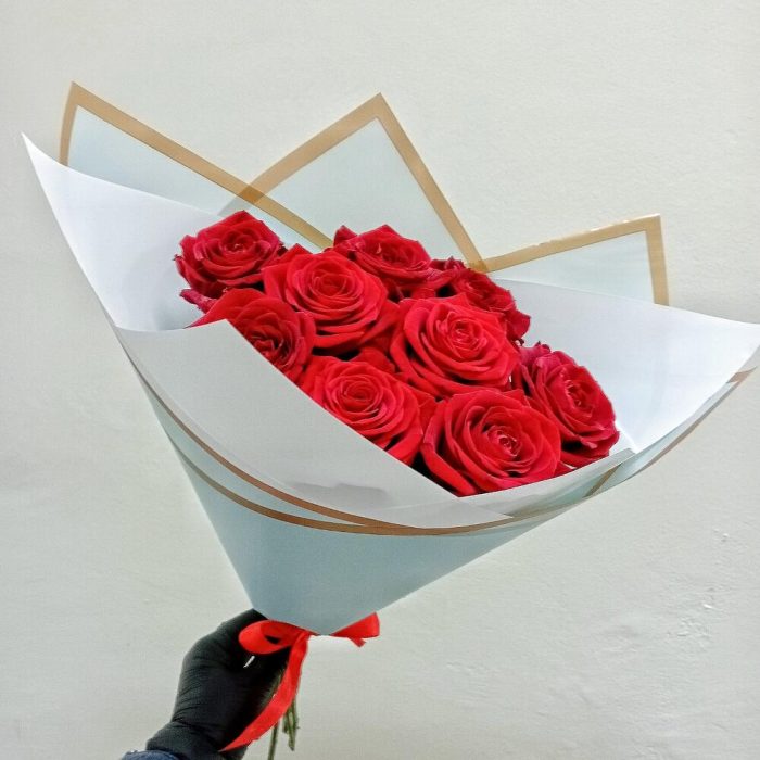 Лента атласная – 1 шт.Пленка дизайнерская – 2 шт.сортовая роза red naomi – 9 шт.