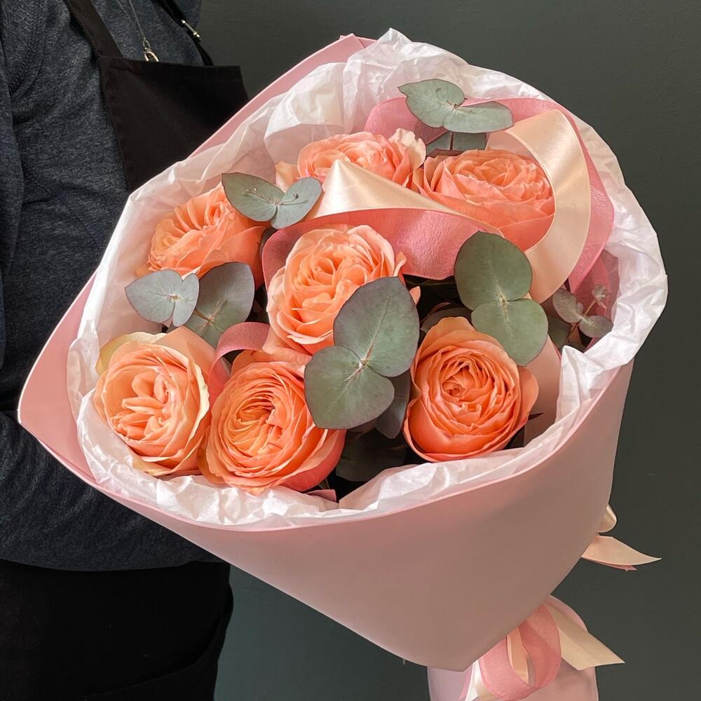 Букет из пионовидных персиковых роз и эвкалипта