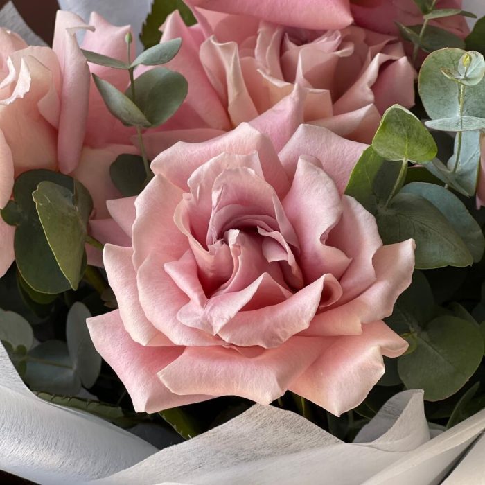 Лента – 2 шт.Эвкалипт – 2 шт.Роза одноголовая – 5 шт.Упаковка дизайнерская – 2 шт.