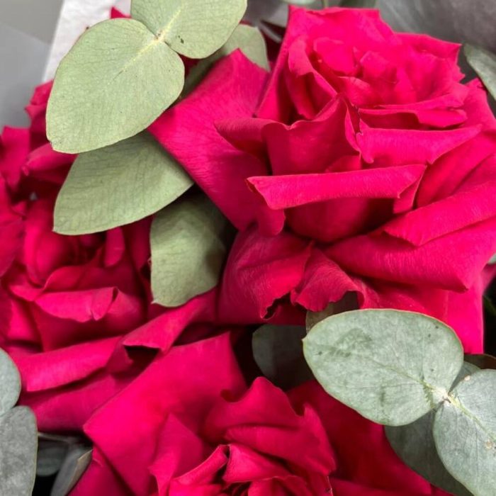 Букет с малиновыми розами и эвкалиптом