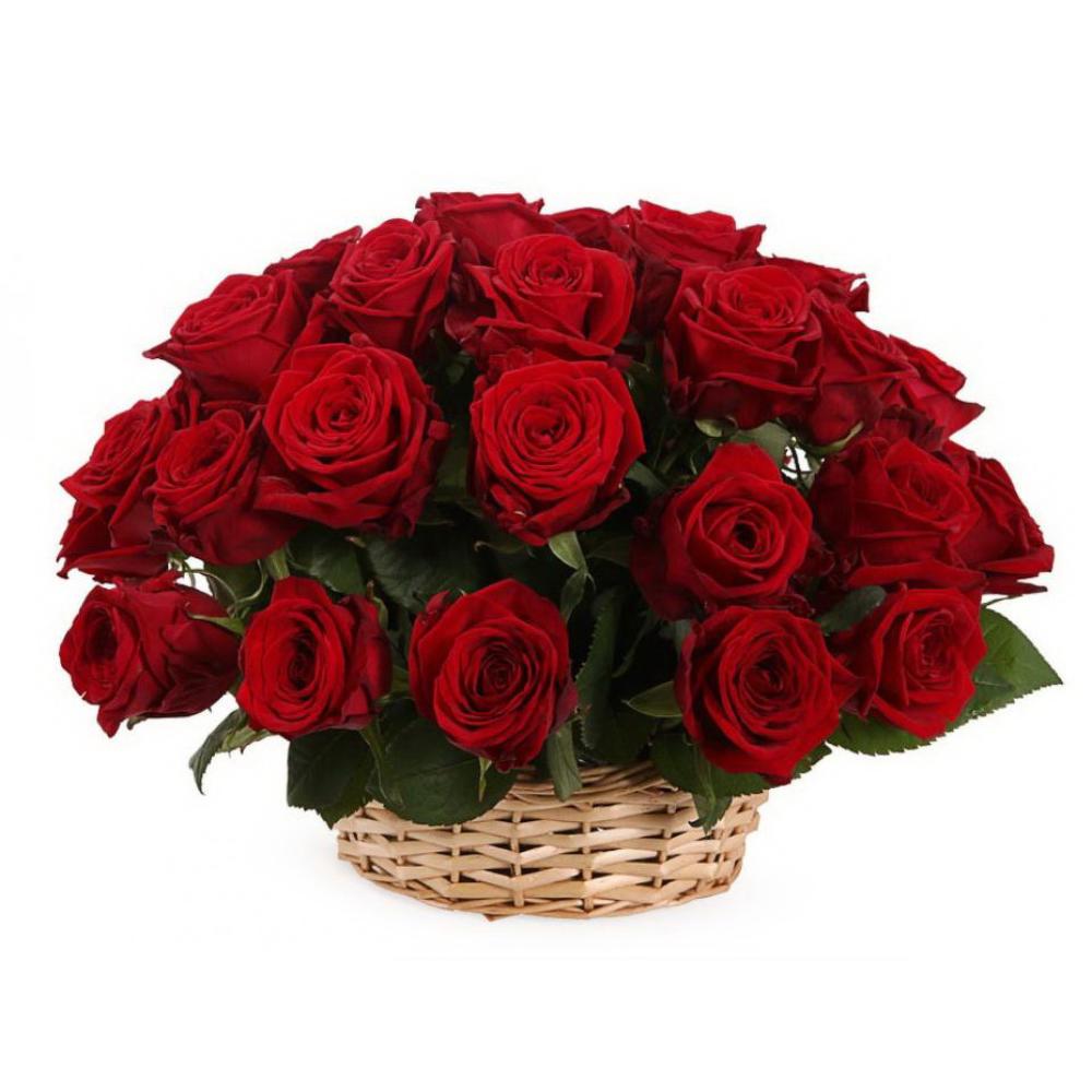 Роза красная 60 см – 25 шт.Пиафлор (оазис) – 2 шт.Корзина плетеная – 1 шт.Упаковка пленка – 1 шт.Лента атласная – 1 шт.