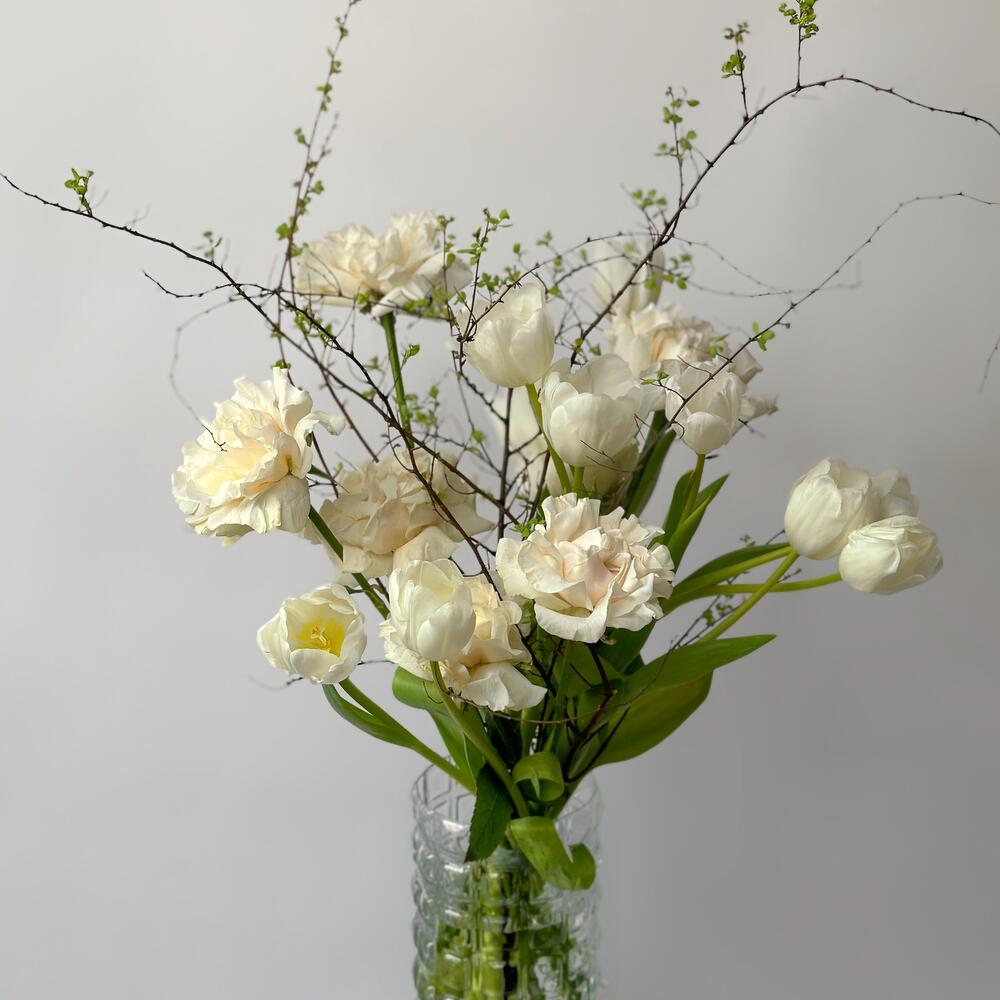 Кремовый букет с розами, тюльпанами и цветущими ветками