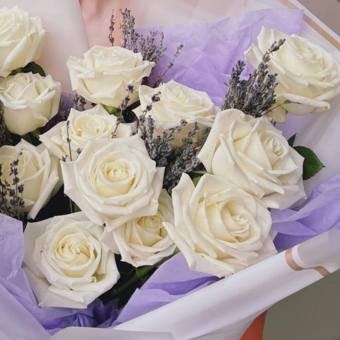 Букет из белых роз с ароматной лавандой