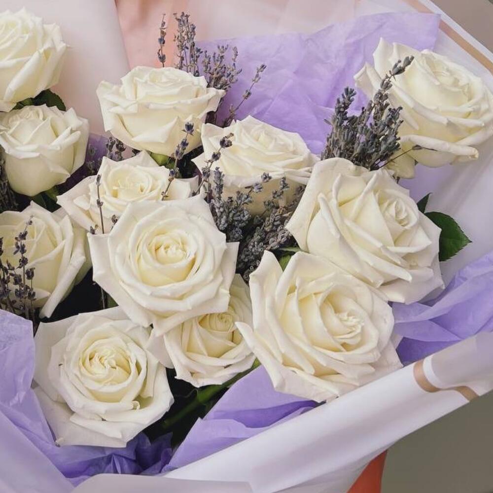 белые розы – 15 шт.Лаванда пучок – 1 шт.Упаковка дизайнерская – 1 шт.